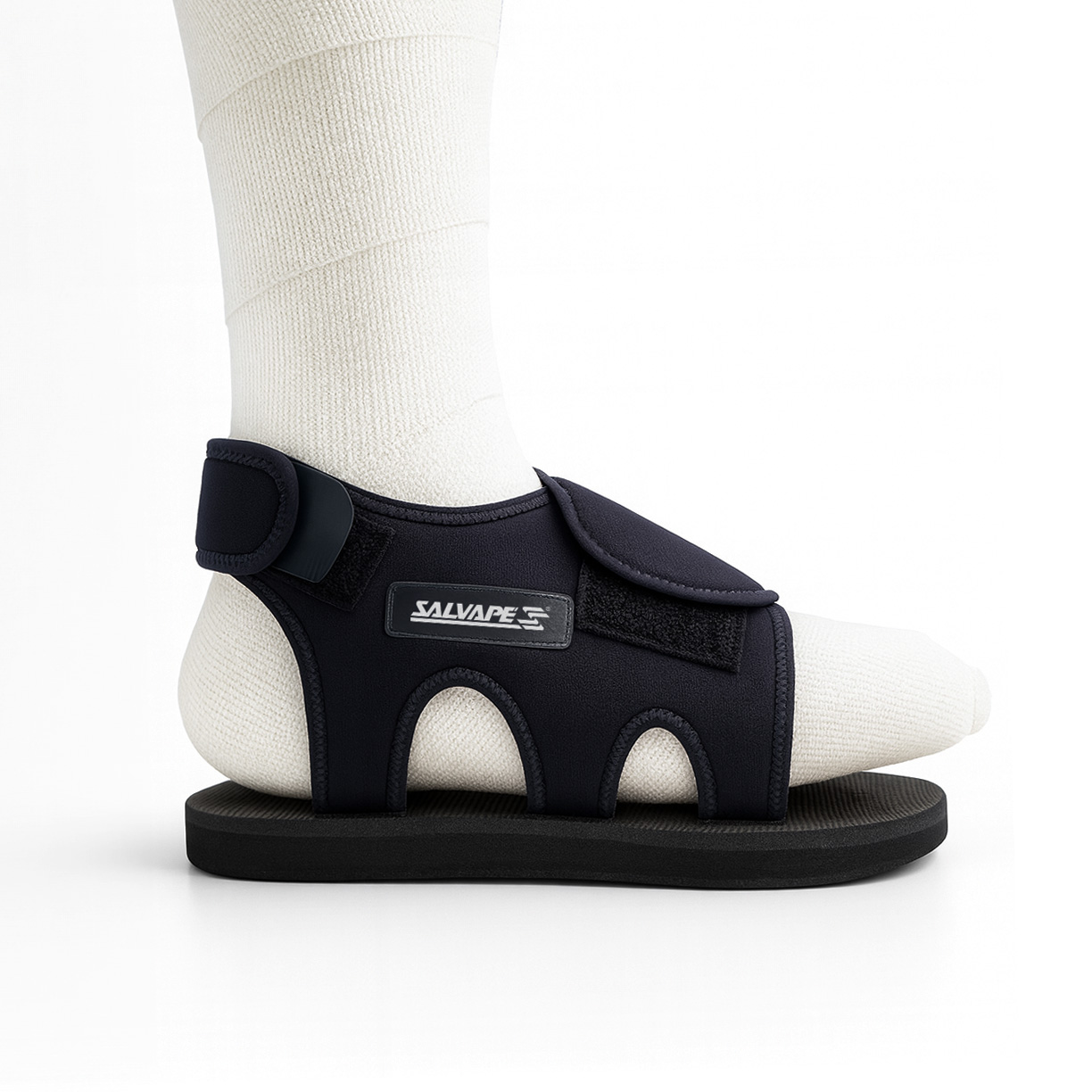 Solado em EVA/Látex com discreta curva para marcha. Fácil colocação. Tecido sintético que permite ajuste perfeito à bota gessada.